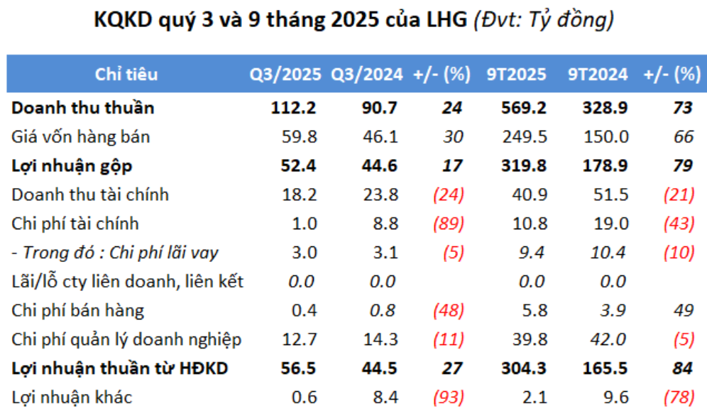 Công ty Cổ phần Long Hậu (LHG) vừa công bố kết quả kinh doanh 9 tháng đầu năm 2025 với nhiều điểm sáng. Doanh thu và lợi nhuận đều tăng mạnh, vượt xa kế hoạch năm. Tính đến hết quý III, Long Hậu đã hoàn thành 93% kế hoạch doanh thu và vượt 70% chỉ tiêu lợi nhuận cả năm.