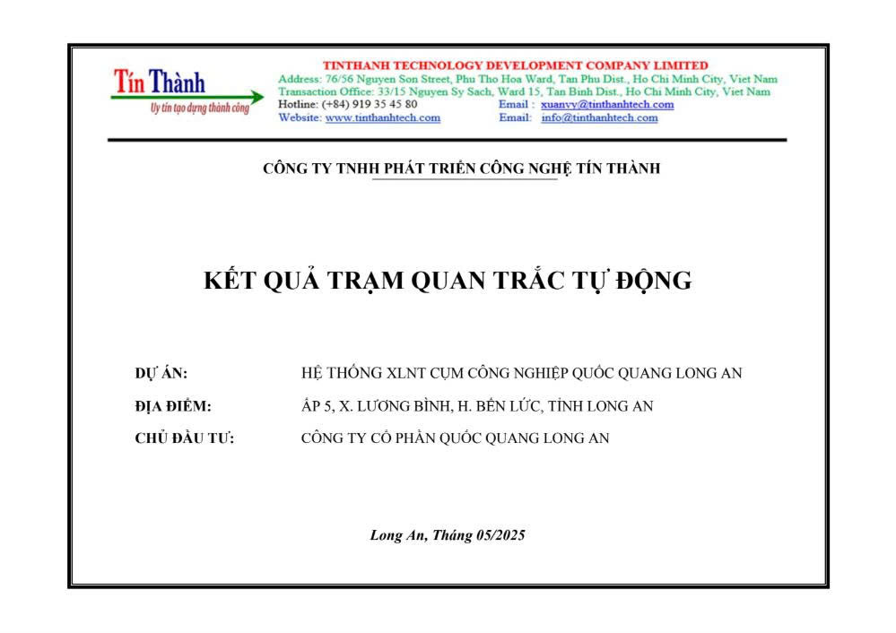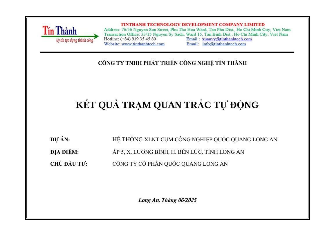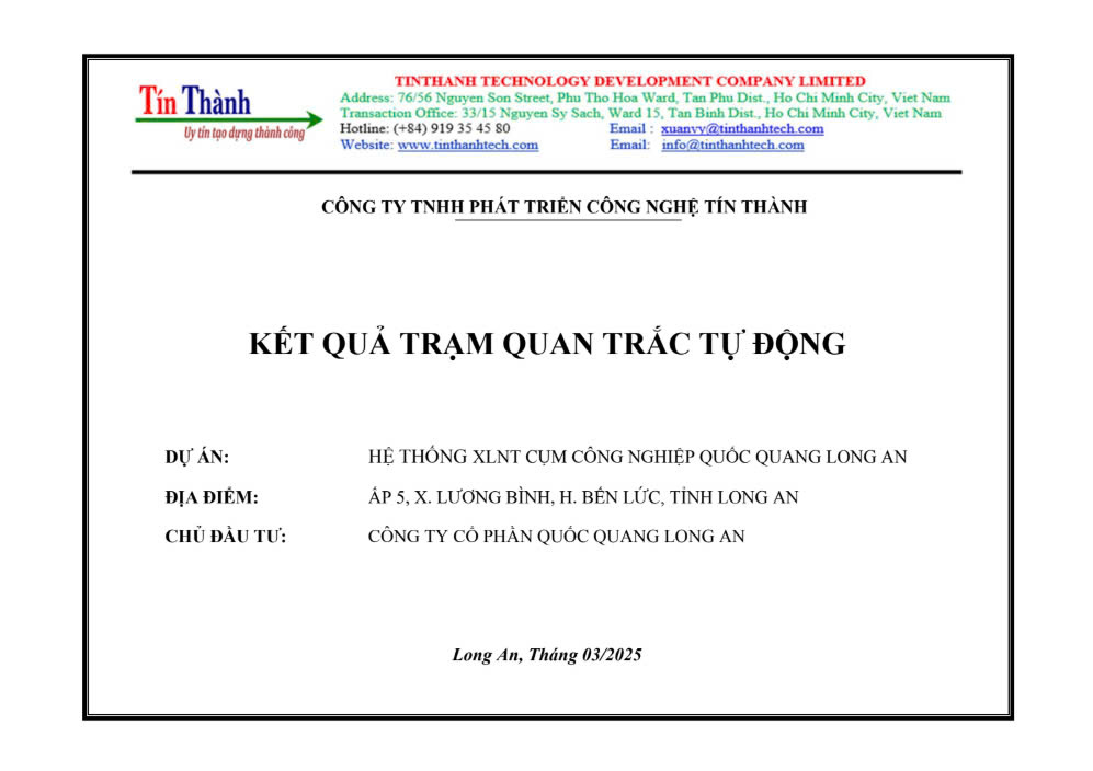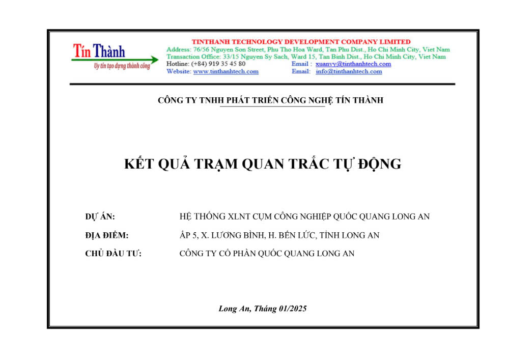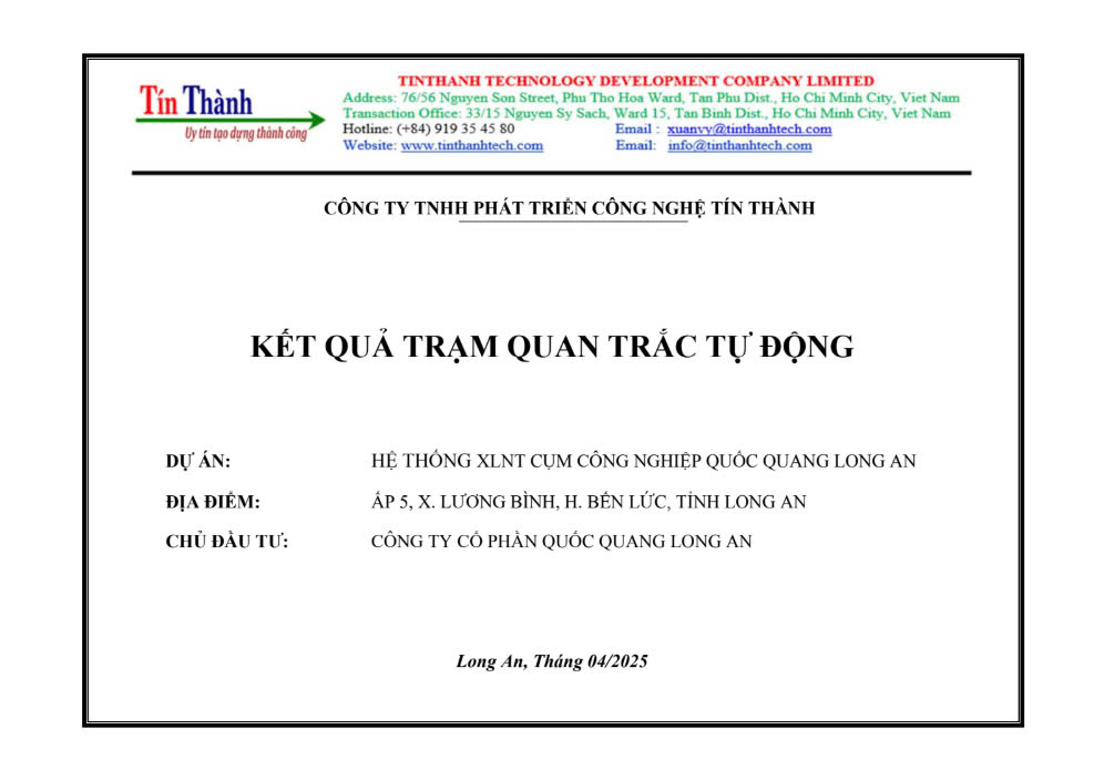 Trạm quan trắc tự động tại Cụm Công nghiệp Quốc Quang được vận hành liên tục với đầy đủ các thiết bị tiên tiến nhất nhằm ghi nhận và báo cáo dữ liệu môi trường. Dưới đây là báo cáo kết quả quan trắc tự động ghi lại toàn bộ các thông số quan trắc tại Cụm công nghiệp Quốc Quang Long An năm 2025: